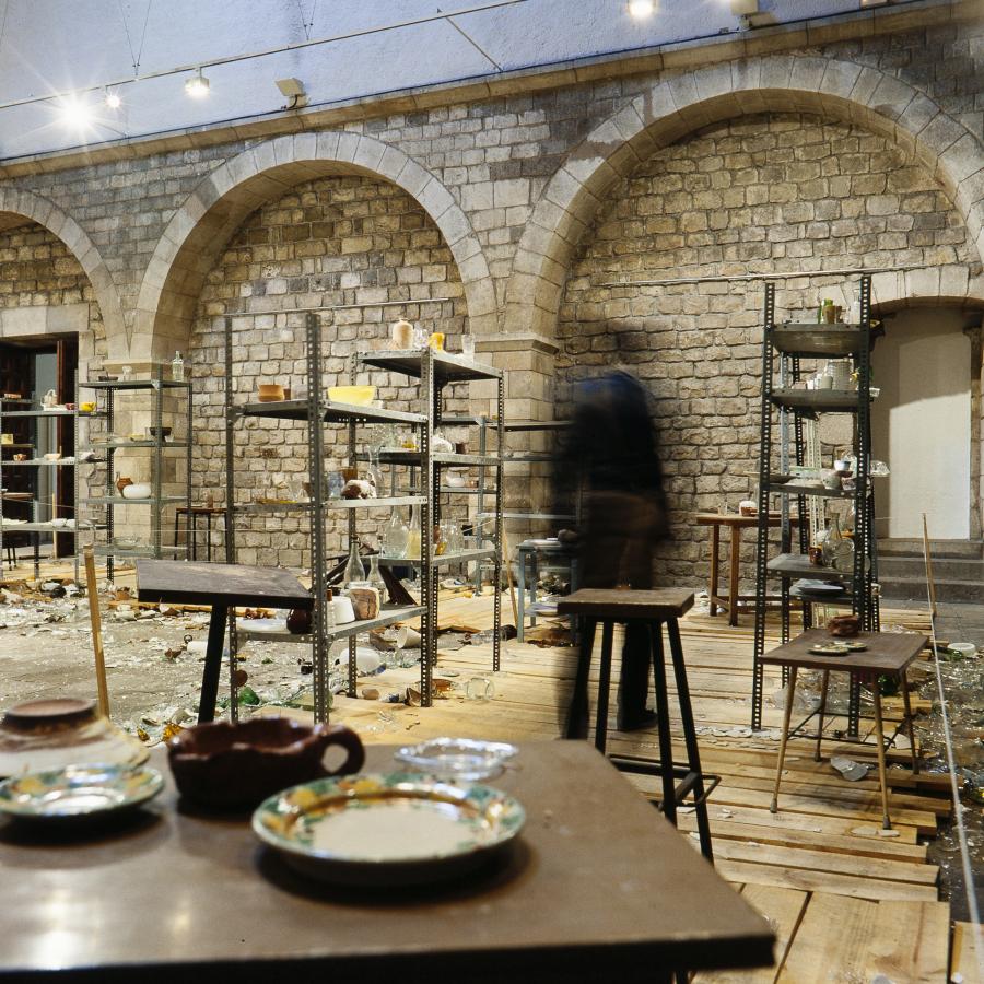 En segon lloc, un altre dels aspectes fascinants d’aquesta obra és que neix en la confluència natural del mirar i del llegir, en la millor tradició pre-il·lustrada de <<conèixer per la imatge>>. Observem, com s’origina en un camí de brases, llit del cremar, metàfora del viure com crepitar i com consumir-se (durant l’exposició el camí de brases roman com un camí de cendres). A partir d’aquest eix vertebrador, es presenten en el recorregut dues vies disjuntives que al mateix temps són prolongacions d’aquest centre vital. Totes dues opcions ens condueixen a imatges del cor: sobre una peanya, un manual d’anatomia antic el descriu en llenguatge científic i en mostra el dibuix. Sobre una altra peanya, a la mateixa altura i distància del camí, un recipient transparent conté una rèplica confeccionada a partir del natural d’un cor de dona.
