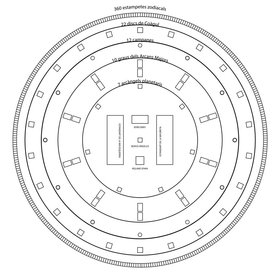 In an exercise of ritual dissection, O’Callaghan will use the Major Arcana Tarot cards to revisit and reformulate a decade of work in which he has explored the connections between magic and science, sex and spirituality, mass culture and subculture, often through industrial sounds and hypnotic rhythms. Taking the recent loss of his archive as his starting point, the artist proposes to coagulate a decade of sound, somatic and performative experimentation in situ. Various items that make up the coagulatory cabinet of curiosities will guide him and serve as a physical support: the ten Arcana Major Tarot cards O’Callaghan has designed, his collection of twelve bells, the 22 records released so far by Coàgul and 360 small prints of the zodiac.