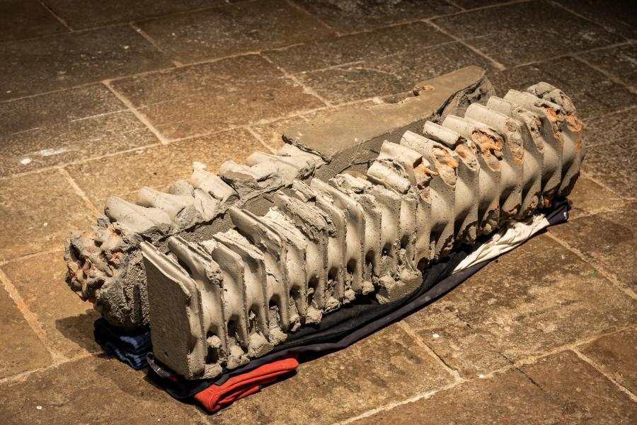In the fifth movement of “Les Escenes”, some works extend across the floor. Others consider the symbolic terrain on which we live. All of them invite us to complete a journey, alternating sensitive memory and the ability to anticipate. This time we have to look down. The works are realistic in the meaning given to this word in Ben Lerner’s verses: “If you have to look up it’s religious. / If you have to look down it’s realistic.” Down, like the researcher or the gold prospector, but also the scrap collector and the beggar. With all of these people, to find the structures, or their remains, and the silenced evidence of poverty – or the second life of recycling: of objects, of ideas, of worldviews.