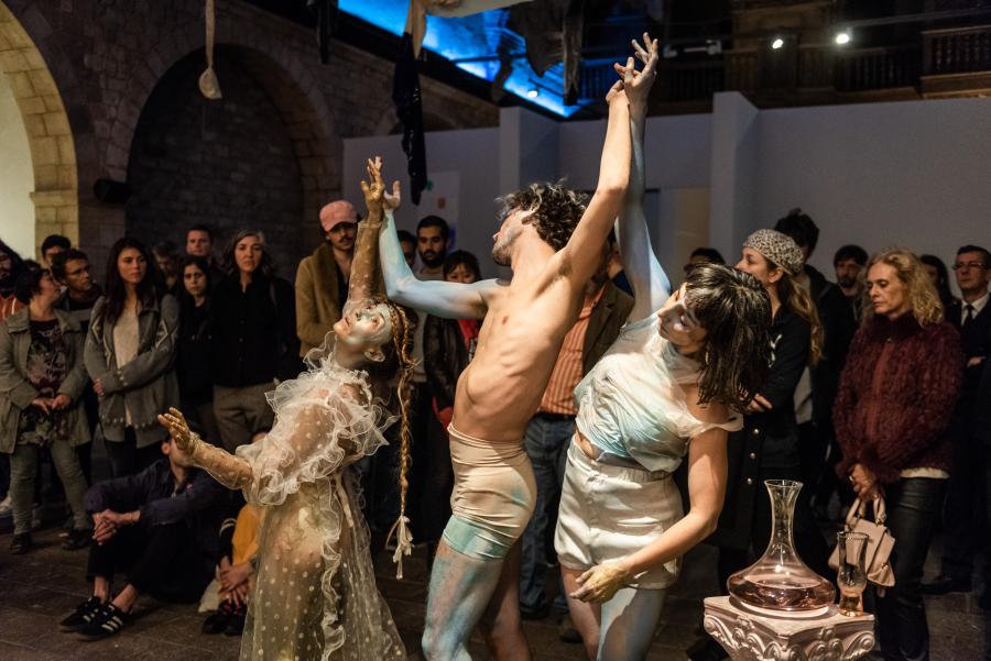 In exploring these two aesthetics, we create a third that reveals itself in a body-(dis)composure. We offer our dance as a human sacrifice that makes the wheels of history go further and then finds itself dragged beneath them. We use the human body as a living archive of the representation of the female form, from Boadicea to Beyoncé, subverting the established ideals of physical beauty in art, fashion and popular culture from the time of the Romans to the Romantics in order to question our collective vision today. Rather than following the latest trend of taking dance into museums, our aim is to take the museum to the dance in order to shake up and renew its grammar. Like the goddesses of the Parthenon in the British Museum, we have been moved and stripped from our natural context and we find ourselves in the public eye as an object to be scrutinised and marvelled at. So much so that the polemic on how the female body is to be presented in contemporary society, between burkinis and Birkin bags, is so over the top that something as stupid, meaningless and surrealist as putting a slice of cooked ham on your face (tranche de jambon) can become an extremely thoughtful and potentially very offensive political strategy.