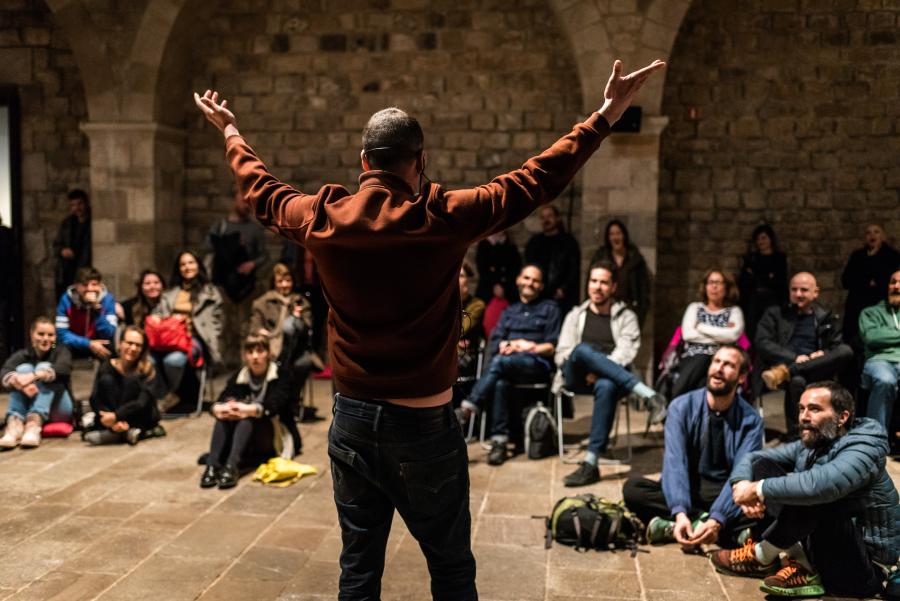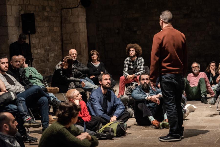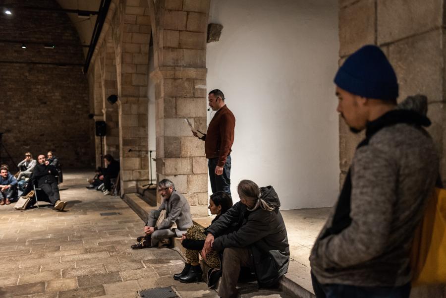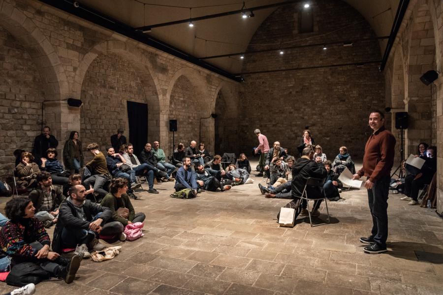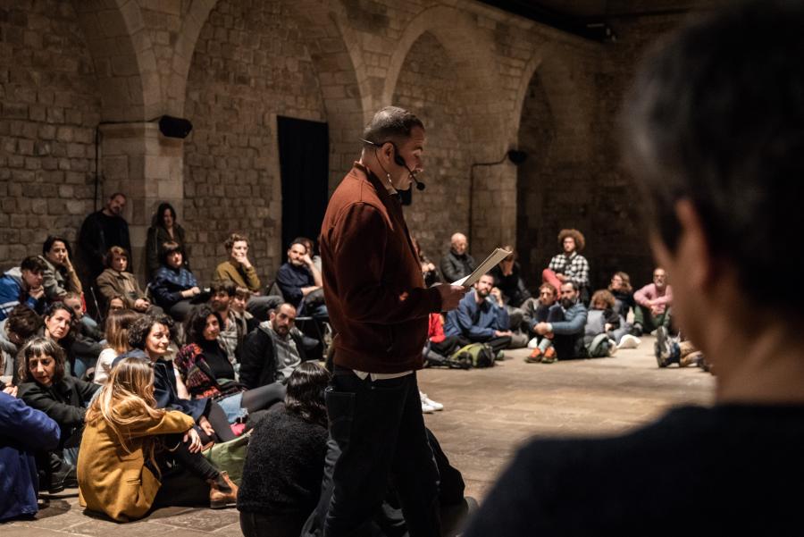 Quim Pujol (1978) is a writer, curator and artist. He works at the boundaries between writing, the live arts and contemporary art. Since 2014, he has been exploring and modifying existing body techniques for political purposes. His latest works along these lines are Trance colectivo (2014), ASMR del futuro (2015), BDSMmm (2016) and Fregoli (2017). He has shown work in exhibitions such as Intervalo. Acciones sonoras, at the Antoni Tàpies Foundation, and Visceral Blue, at La Capella. Together with Ixiar Rozas, Pujol edited Ejercicios de ocupación (Ediciones Polígrafa, 2015) on affective theory. He curated the Irregular Section at the Mercat de les Flors between 2011 and 2015 and he has also taught on the Independent Studies Programme run by the MACBA (Barcelona Museum of Contemporary Art).