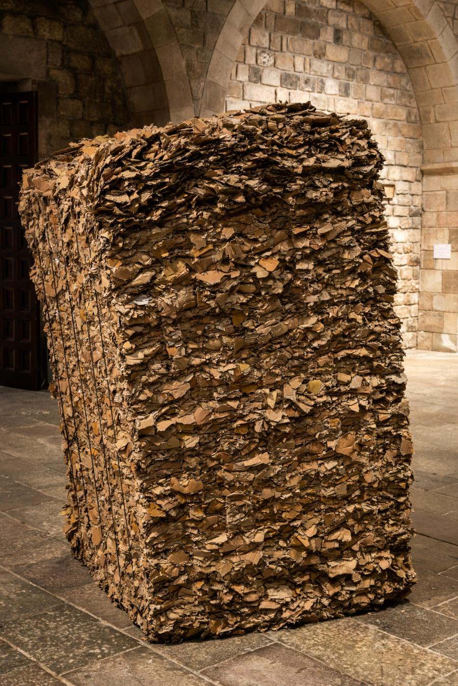 De entrada, otra manera de empezar apunta a la idea de obra y a su condición física dentro de una sala de exposiciones. En Fardo (2018), de Julia Spínola (Madrid, 1979), la materialidad y sus procesos invitan a entender el objeto artístico desde una autonomía propia. Una cierta autonomía donde lo inerte –en este caso, un enorme fardo de cartón– parece liberarse de lo que se espera de él para quedar reducido a pura esencia especulativa. Un proceso de borrado que también afecta a la materia. Es la desmemoria entendida como un ejercicio de equilibrios: la compresión que deriva de la acumulación.