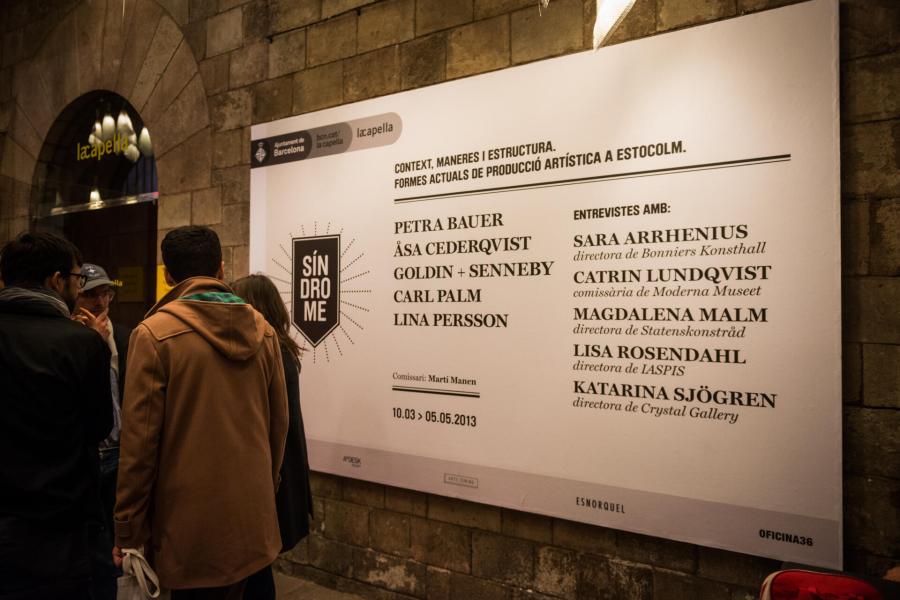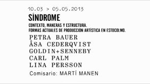 “Síndrome” propone una aproximación variable a un contexto específico: la creación artística en Estocolmo. La capital de Suecia, uno de los ejemplos de la sociedad del bienestar, ha contado durante muchas décadas y cuenta todavía con una estructura profesional estable en torno al arte contemporáneo. Instituciones con una larga tradición, plataformas de nueva definición, un sistema importante de apoyo a la creación, universidades y espacios educativos con vínculos y una voluntad internacionales, aunados a una serie de propuestas independientes que aparecen y desaparecen. Y los artistas, siempre los artistas, como elemento clave en la definición de toda la estructura.