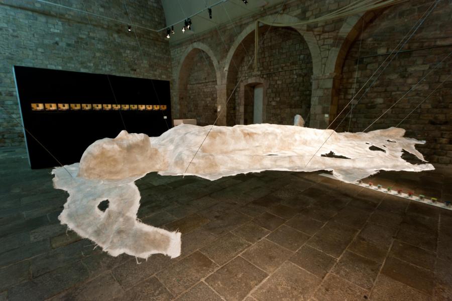Oceànica comparteix aquesta atmosfera introspectiva. En aquest cas, el punt de partida és el cos d’Esther Pi. 1.345 dies ens parla de l’un a partir dels altres, mentre que Oceànica intenta donar una visió més universal, partint del seu propi cos. A partir d’un motlle, el material que compon la peça, gairebé com una gasa, crea un aspecte flotant i de lleugeresa. És una peça efímera i fràgil. El paper japonès es descompon i s’arruga fàcilment. Tot i així, la peça té una presència expansiva.