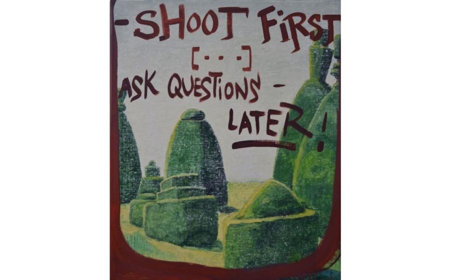 L’exposició que Nilausen presenta a La Capella, Sisyphus, rhopography and a headless chicken, parteix de la visió de l’artista convertit, en ocasions, en una espècie de John Wayne de la pintura contemporània: “shoot first, ask questions later”. O potser, més aviat d’un pollastre sense cap. Instintiu. Pren totes les decisions a base de reflexos espasmòdics; posteriorment, per sort, les analitza. El discurs extrapictòric, que ara com ara podríem anomenar narratiu, en el cas de Nilausen poques vegades es descobreix a primera vista. Es troba velat, en un segon pla. L’avantatge –i la problemàtica– és tot el que es converteix en sensacions quan es contemplar la pintura. Un joc, ja no d’atzar, sinó de coincidències i connexions, més semblant als enllaços a YouTube que al rizoma de Deleuze i Guattari.
