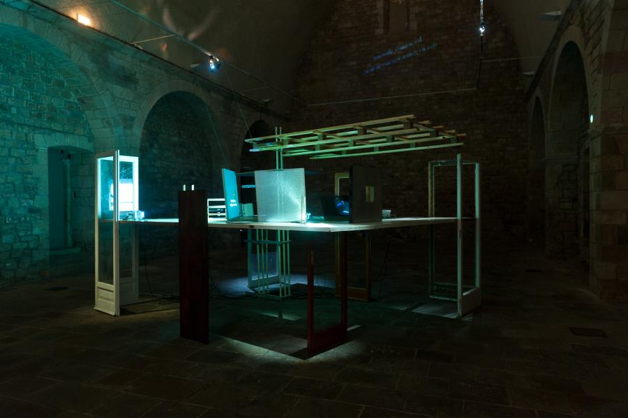 The architectural structures proposed by Julià are not intended to copy existing ones, nor do they seek to deliver harmony between space and a predefined or apparent function. They rather propose to be susceptible to react at the moves and moods of the occupants or visitors that remain unsubordinated to any one specific order. The exhibit’s various elements generate a series of ghosts that in turn map, reflect, or project a variety of narratives and proposals that move away from the distant referential origins. Together they chart a landscape –always linked to human activity, to the presence and technological representation of history and the spirit of objects– that can simulta-neously span a multiplicity of timeframes.